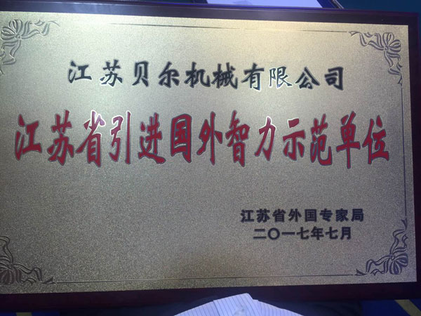 今日,江苏贝尔机械获得了由江苏省外国专家局授予的 江苏省引进国外智力示范单位 称号。"中国的快速发展,及国家对科学研究的重视,使中国逐渐开始成为全世界科学家向往的国度,"国家外国专家局局长张建国说。