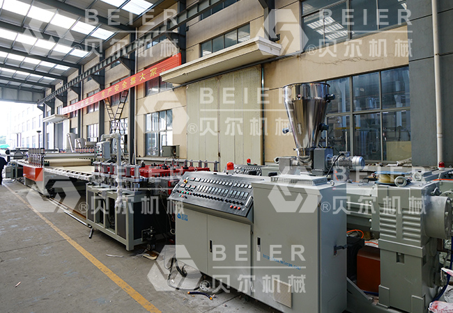 我公司研制生产的PVC木塑发泡板材生产线,所生产的制品一一塑木发泡板集中了木材和塑料的优点,不仅有天然的外观且克服了天然木材的不足之处,具有同木材相类似的良好加工性能,使用木工工具即可完成,且握钉力明显优于普通木质材料;具有与硬木相当的抗压、抗冲击等物理机械性能,并且其耐用性明显优于普通木质材料;塑木材料及其产品,可抗强酸碱、耐水、耐腐蚀,并且不繁殖细菌,不易被虫蛀、不长真菌;还可以抗老化、防静电、阻燃。