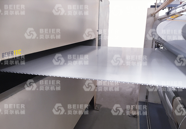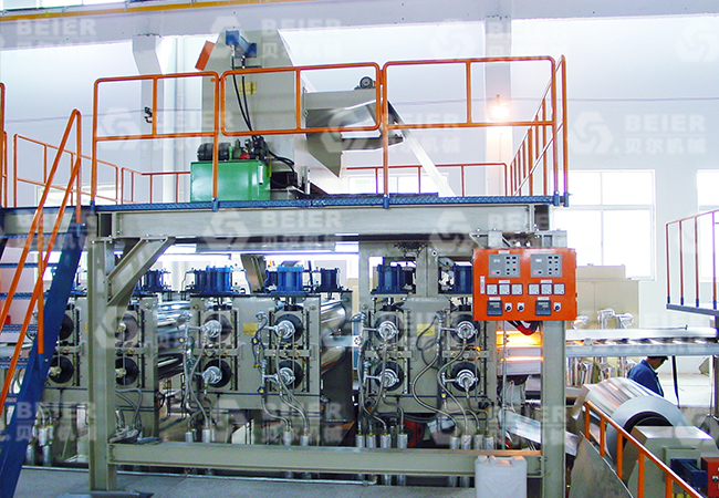 公司结合德国及韩国生产线特点开发的新一代铝塑复合板生产线。通过对复合部份的改进,这样可以使铝卷、高分子膜和PE在复合时一次成型并且效果更佳。此新型设备与老型号相比不仅可以大大节约能源而且操作更为简便,合格率更高,应用广泛,维护方便。此设备生产B1防火板更为合适。同时我们也给该设备配备了机械手,大大节约了客户的生产成本,方便操作。