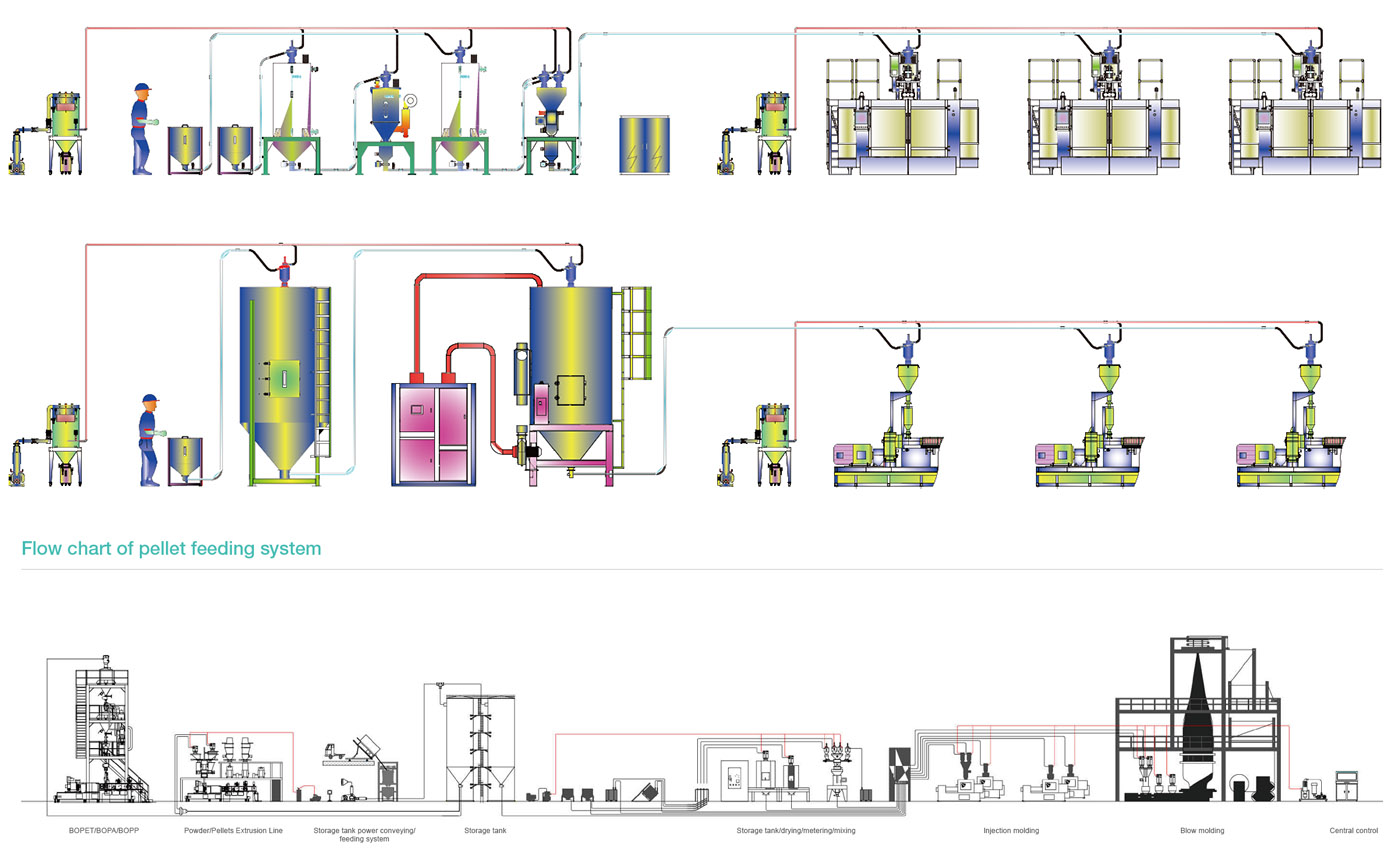 - 集中供料系统可解决原料摆放混乱,在添加原料时容易出错,粉尘不能集中收集问题。可减少工人加料,原料不需要人工搬运,降低劳动强度。